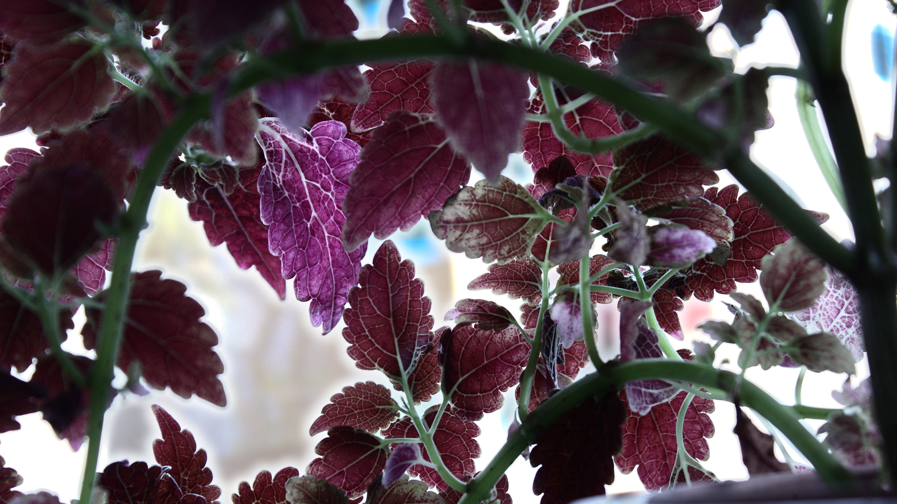 A plant in my window, in unusually good condition after having been near death numerous times. This one leaf had a curiously out-standing color.